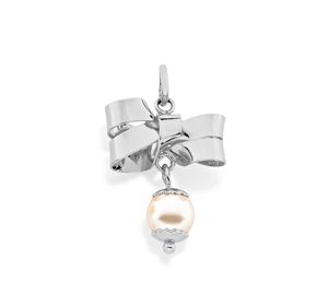 Descrição Pingente formato “laço” com pérola de 8mm pendurada med 2,5 x1,8 cm prata