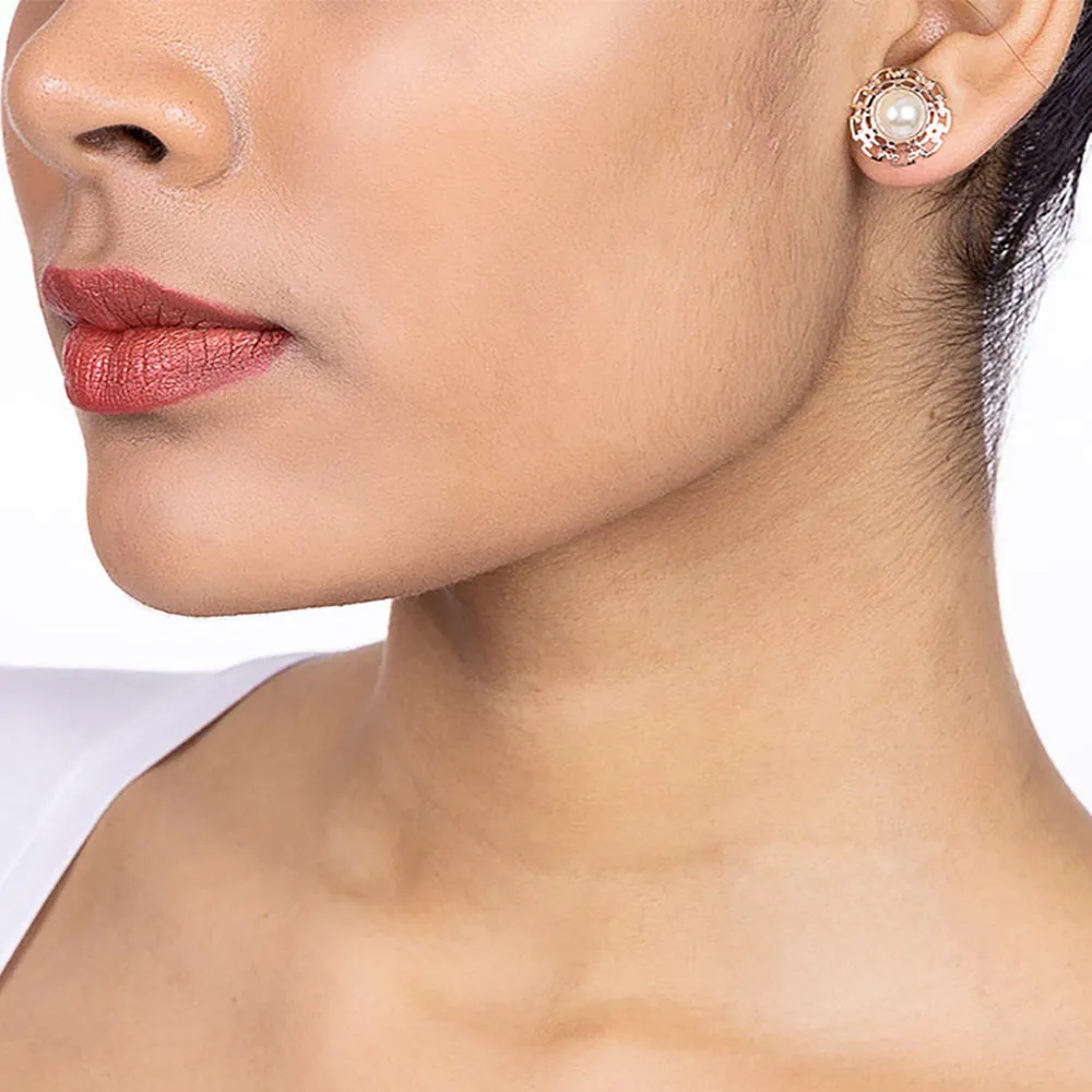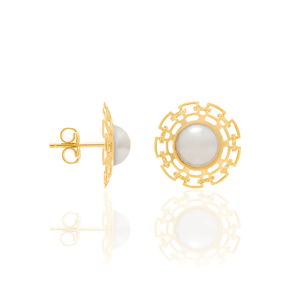 BRINCOS ROMMANEL PEQUENOS BANHADO A OURO 18K REDONDO COM DETALHES VAZADOS SENDO LISOS E TRABALHADOS TENDO PÉROLA DE 7MM NO CENTRO. MED 1,5 CM DIÂMETRO