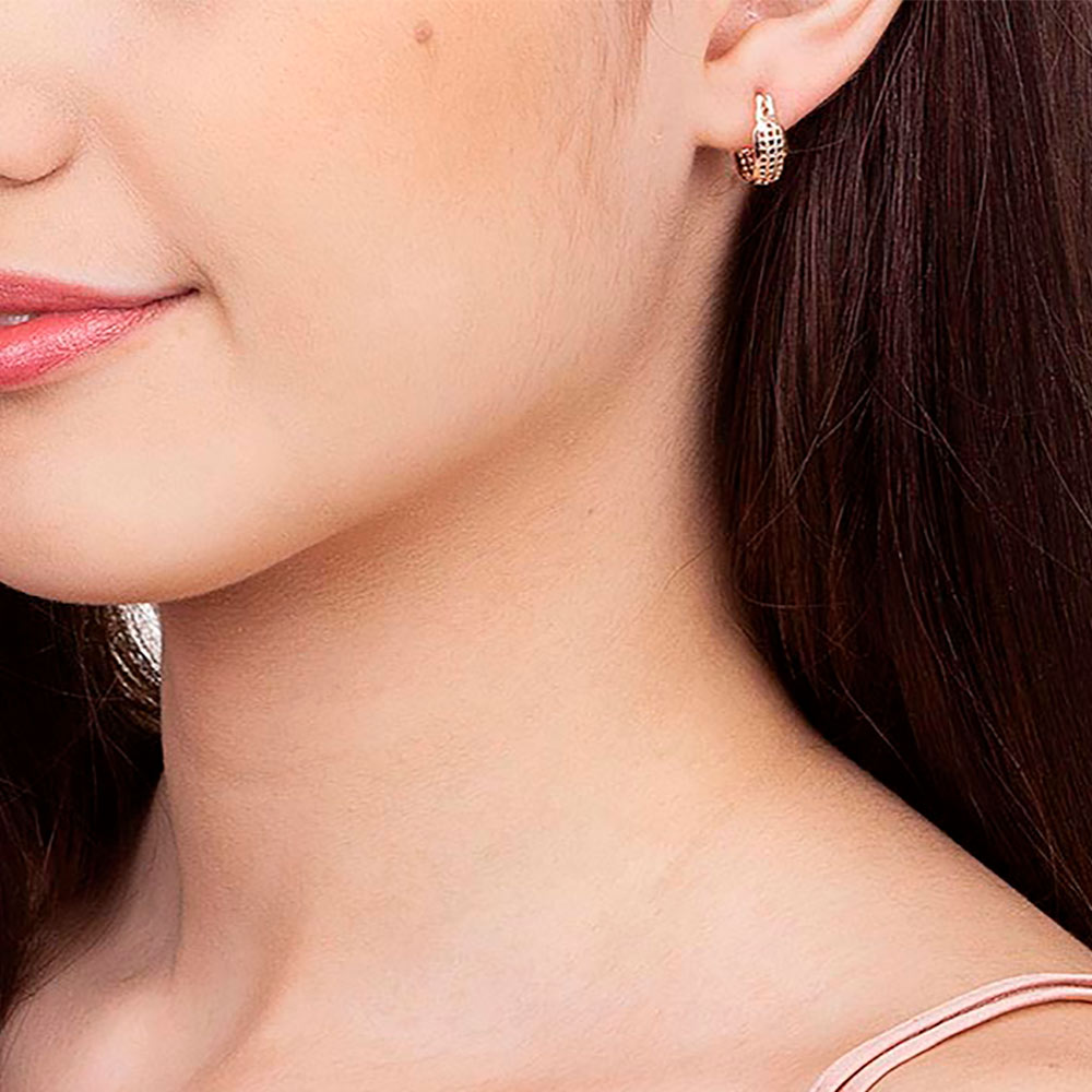 Brinco argola trabalhada com pequenos quadrados vazados.