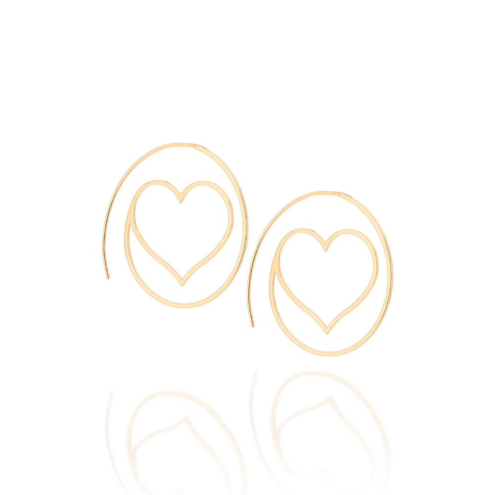 Brinco de gancho no formato “arroba” com detalhe central no formato de coração. med. 3,90cm.