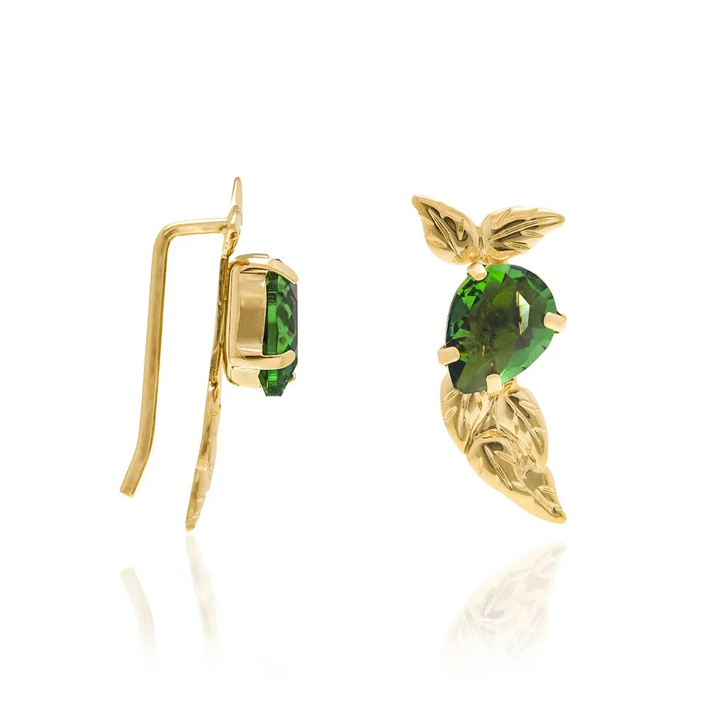 Brinco de grampo formado por peças trabalhadas no formato “folhas” tendo 2 cristais (par) no formato gota de 6x8mm. med. 2,00mm.