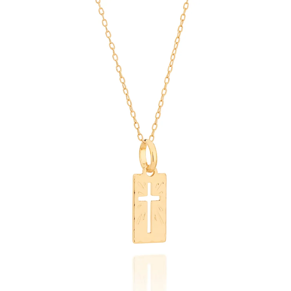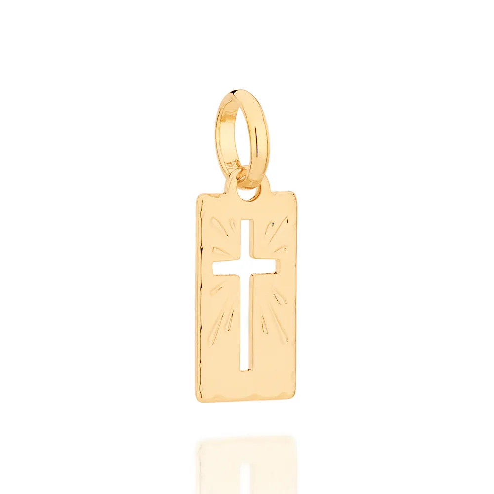 Pingente formato retangular com cruz vazada no centro, med. 1,5 x 0,6 cm